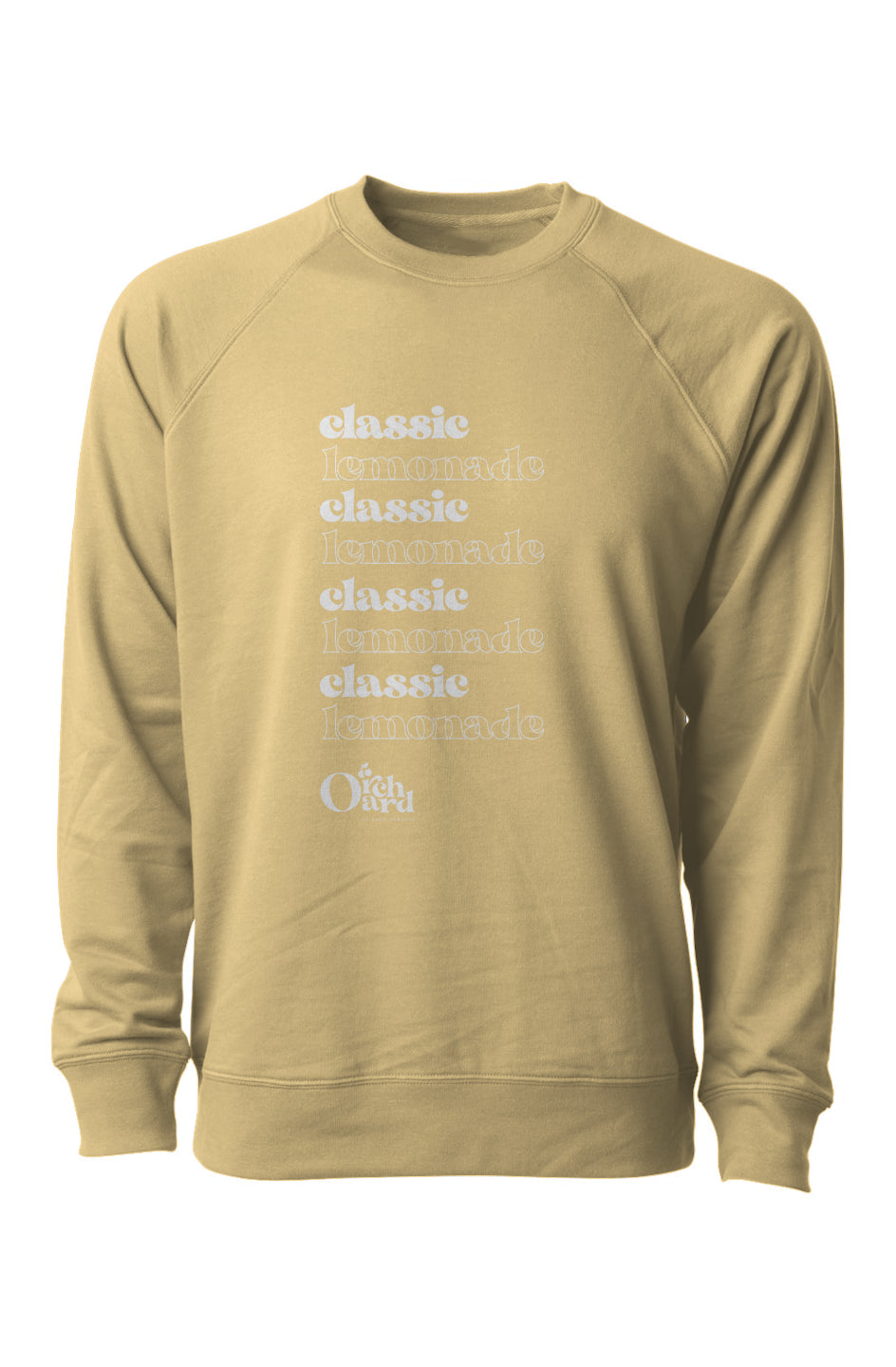 The Classic Lemonade Crewneck takes Orchard’s most timeless flavor and turns it into an everyday essential. Featuring the signature stacked classic lemonade typography on a soft, lemonade-toned crewneck, this piece delivers effortless style with all-day comfort.