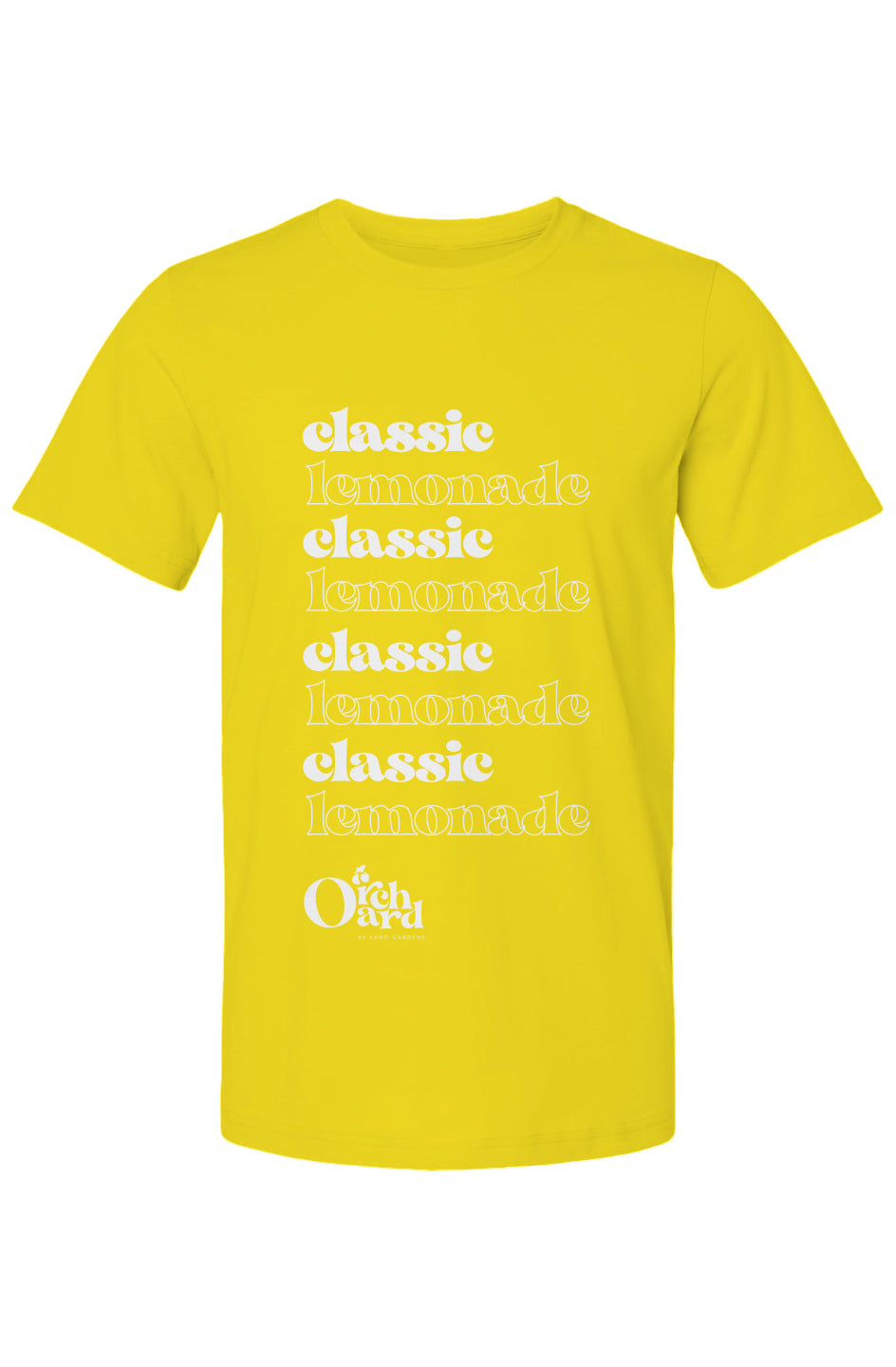The Classic Lemonade Tee is part of the exclusive Orchard Lemonade Series, created in collaboration with LivWell. Featuring a stacked typographic treatment of classic lemonade in soft white on a warm, washed lemonade-colored tee, this design keeps things simple—just like the flavor that inspired it.