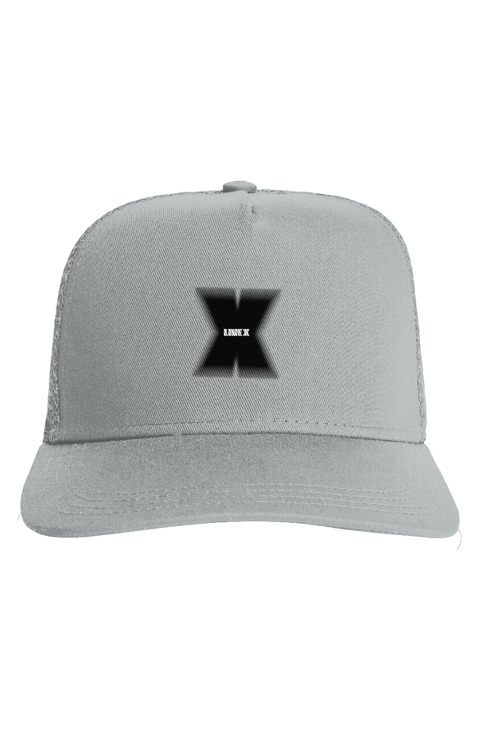 A structured grey trucker cap featuring a bold black "X" with a halftone aura and the LIVE X insignia at the core. The contrast hits hard, channeling the unapologetic energy of experimental cannabis, late-night labs, and subterranean frequencies. Built to pair with your favorite strain and your least favorite authority.