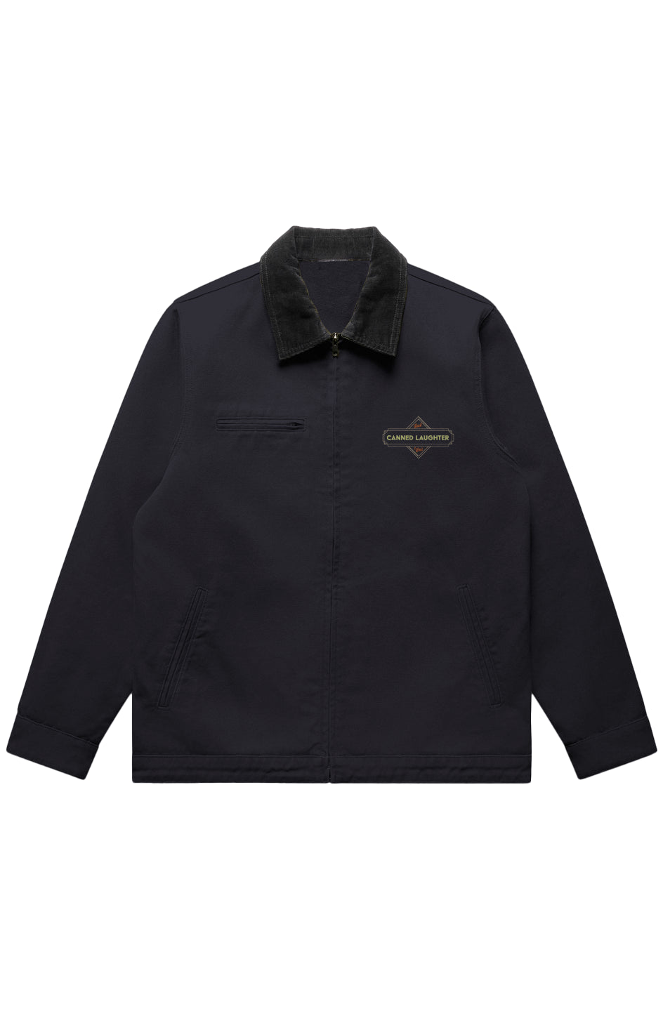 Listen. It’s a work jacket. It does jacket things. You put it on, you look better immediately, and you don’t freeze to death. Herb’s face is on it because he insists. Mine’s on it because I’m the talent. Canned Laughter on the front—embroidered—so it’s official.
