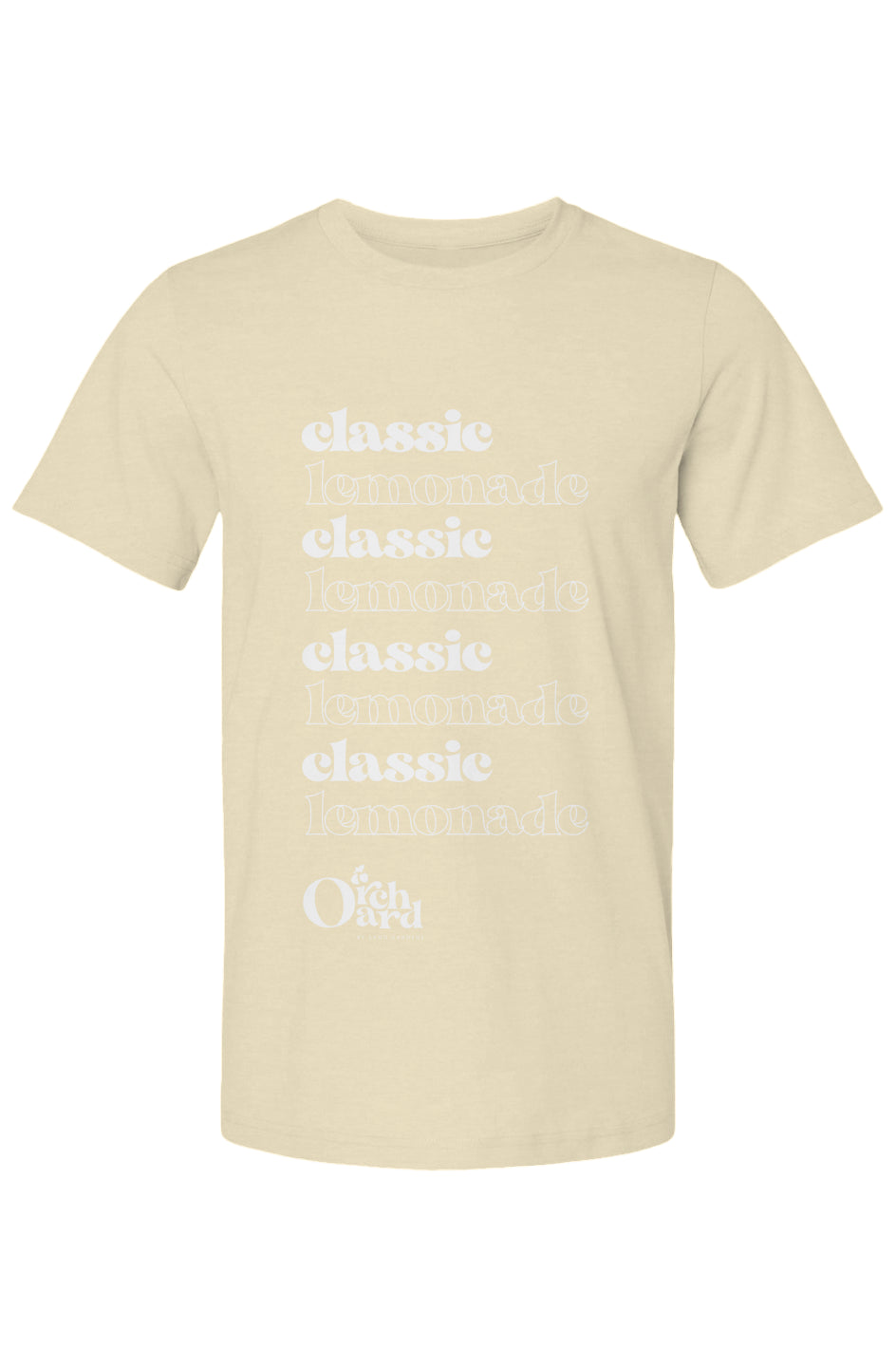 The Classic Lemonade Tee is part of the exclusive Orchard Lemonade Series, created in collaboration with LivWell. Featuring a stacked typographic treatment of classic lemonade in soft white on a warm, washed lemonade-colored tee, this design keeps things simple—just like the flavor that inspired it.